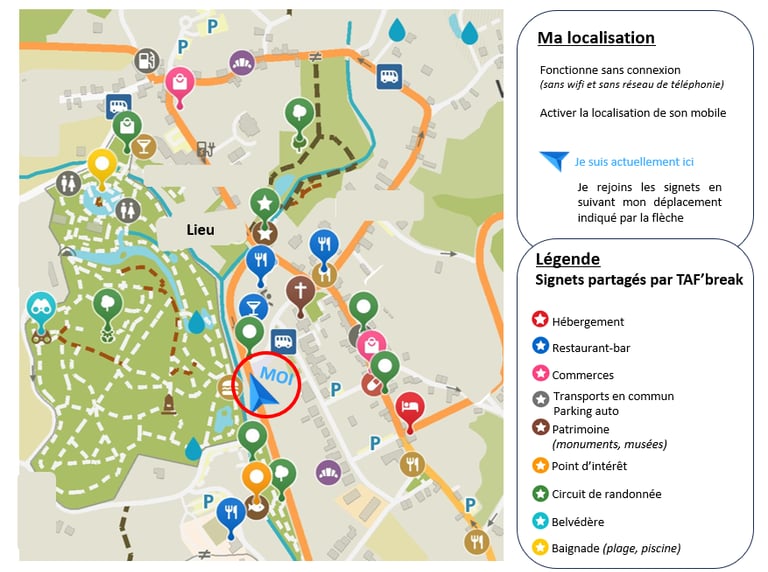 Repérez facilement les lieux d’intérêt par thématique : restaurants, commerces, baignade, patrimoine, parkings gratuits, randonnées